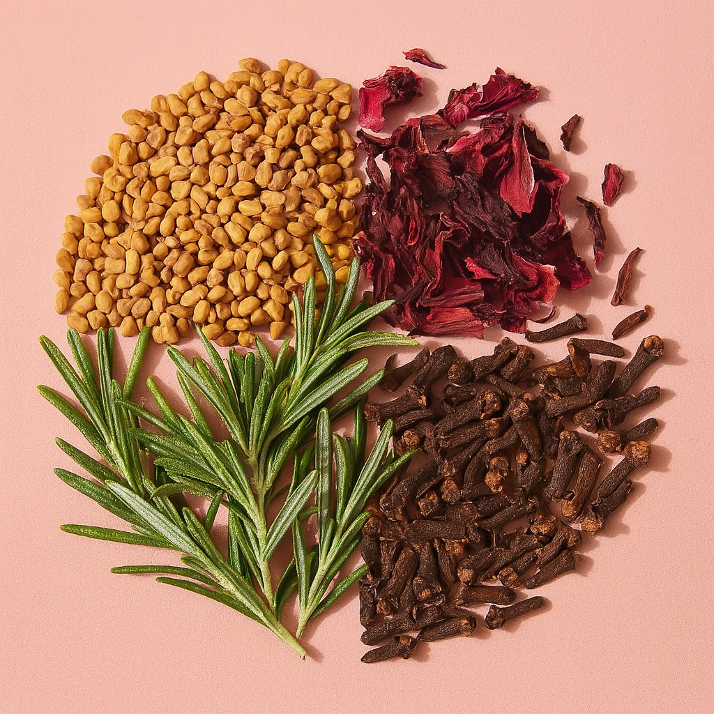 Grapeseed oil infused with rosemary, fenugreek seeds, clove buds, and hibiscus petals.